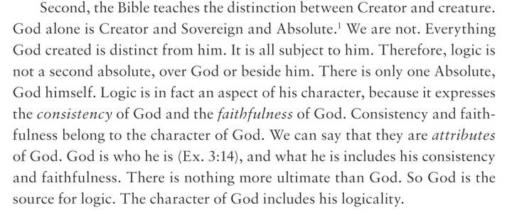 上帝并不是逻辑, 逻辑也不是上帝, 逻辑是上帝自身固有的属性, 正如同圣洁是上帝自身固有的属性.